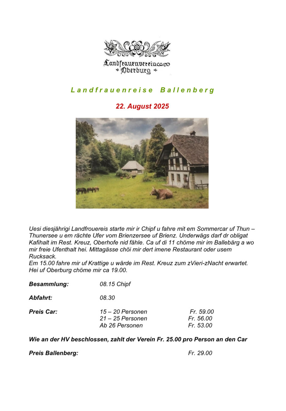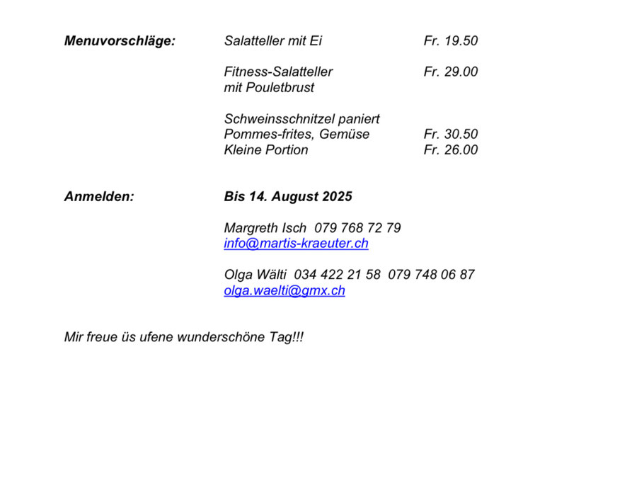 Jeden 1.Dienstag im Monat findet eine Wanderung statt. Dazu könnt ihr euch bei Verena Bolzli 079 652 19 17 melden. Es existiert eine WhatsApp Gruppe.